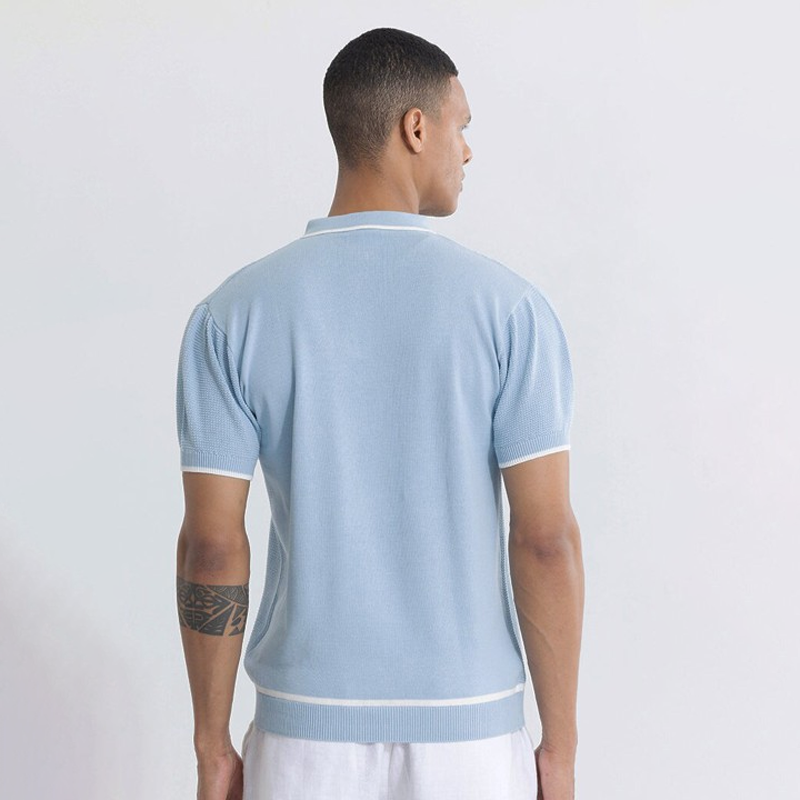 Blue t-shirt for menSelf designRegular lengthPolo collarShort, regular sleevesCotton fabricZip closureSize & FitSlim FitThe model (height 6') is wearing a size MMaterial & Care100% CottonMachine Wash