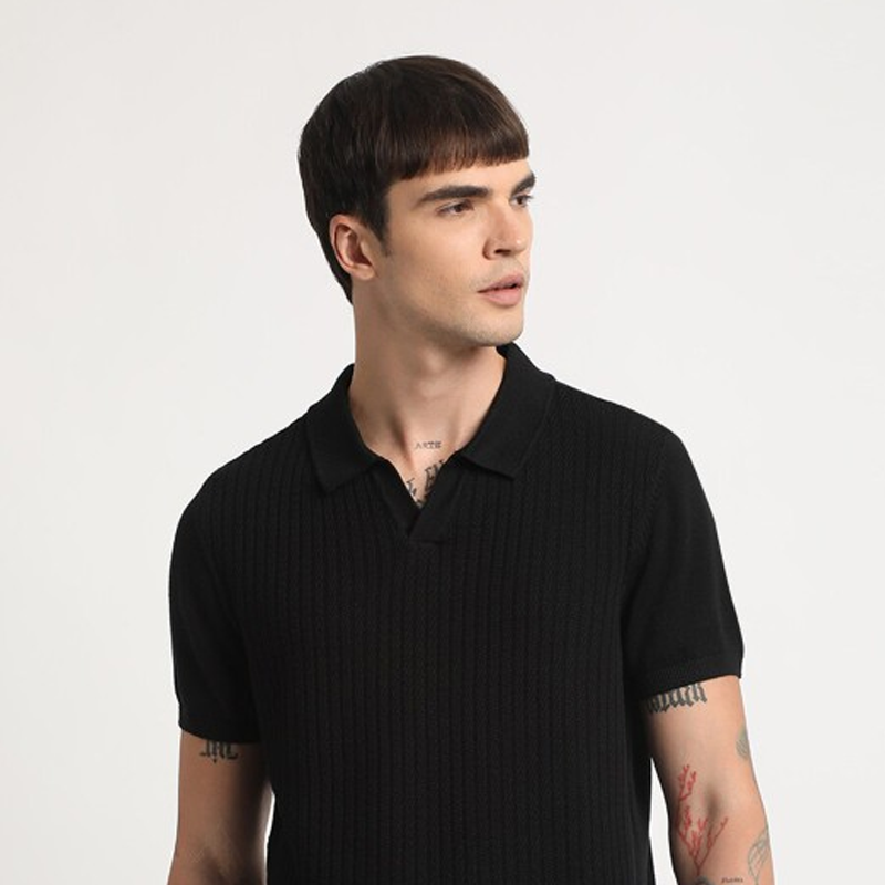 Black Tshirt for menSelf designRegular lengthPolo collarShort, regular sleevesKnitted cotton fabricButton closureSize & FitRegular FitThe model (height 6') is wearing a size MMaterial & Care100% CottonMachine Wash