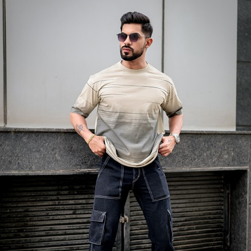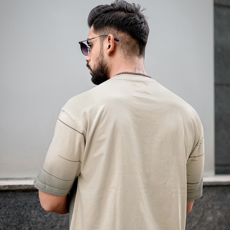 Beige Tshirt for menprintedLongline lengthRound neckShort, regular sleevesKnitted cotton fabricSize & FitOversizedThe model (height 6') is wearing a size MMaterial & CareCottonMachine Wash